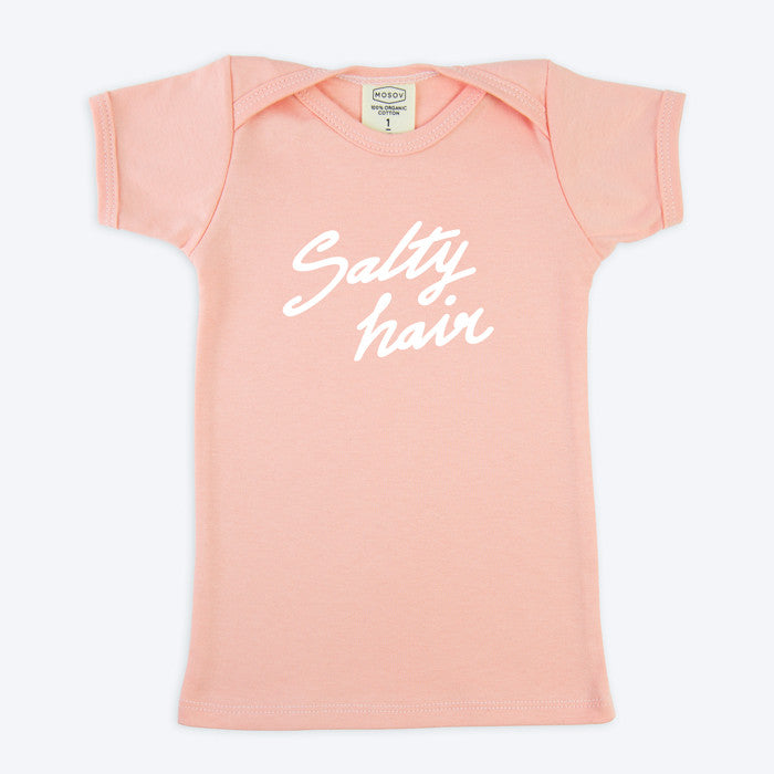 Salmon pink organic cotton baby t-shirt with a hand screen printed design.